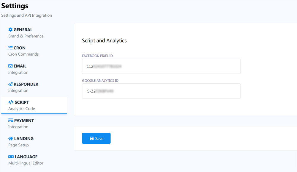 要開始使用 Facebook Pixel 或 Google Analytics 追蹤網站訪客,只需新增相應平台提供的程式碼(僅 ID,而非完整的 JS 腳本)。一旦新增程式碼,分析腳本將自動載入到您的應用程式登陸頁面,讓您開始收集有關網站流量和使用者行為的寶貴數據。有了這些資訊,您可以就行銷策略做出明智的決策,並優化您的網站以提高參與度和推動轉換。