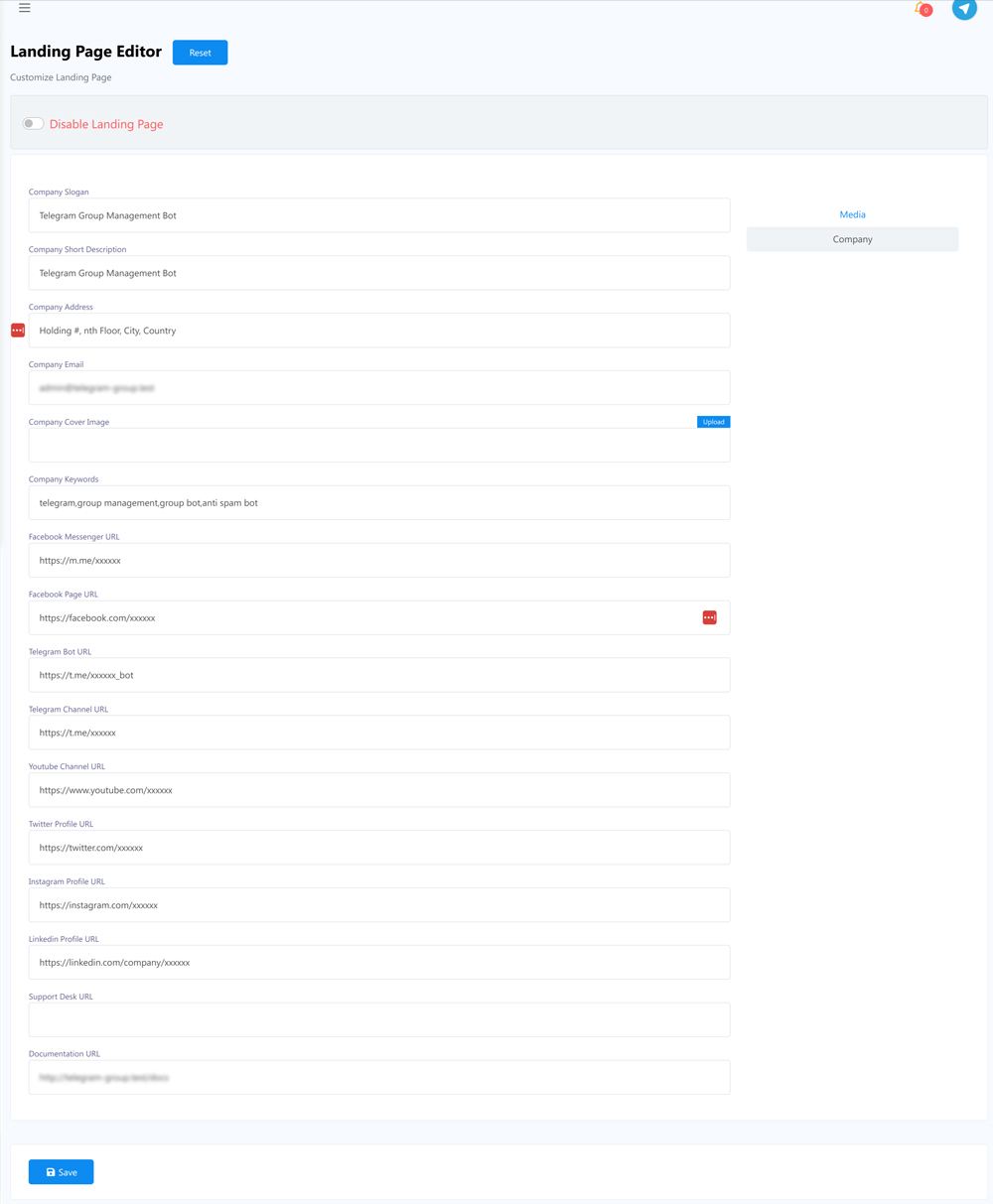 此頁面允許您自訂公司資訊並優化 SEO 元資料。您還可以更換登陸頁面上的現有媒體並顯示客戶評論以提高參與度。您可以使用「語言編輯器」來變更登陸頁面內容,本文稍後將討論這一點。