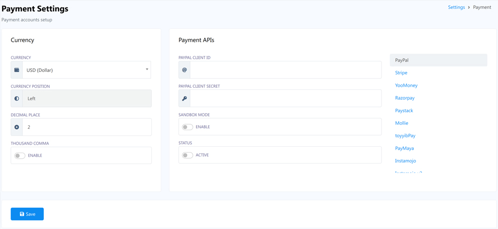 我們目前支援不同的付款方式,包括 PayPal、Stripe、YooMoney、RazorPay、PayStack、Mollie、ToyyibPay、PayMaya、InstaMojo、Xendit、MyFatoorah 等。新增您要使用的付款方式,設定貨幣並儲存。