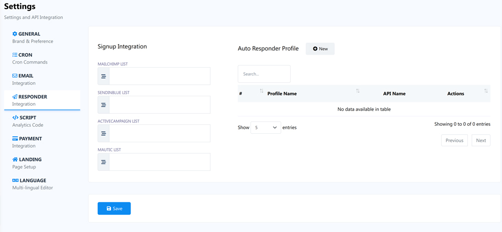 在此頁面上,您可以設定自動回覆設定檔,以自動將任何註冊並驗證其電子郵件地址的新使用者新增到您的電子郵件清單中。這使您能夠將電子郵件行銷工作與使用者獲取過程無縫整合,確保您的訂閱者及時收到來自您品牌的相關內容。